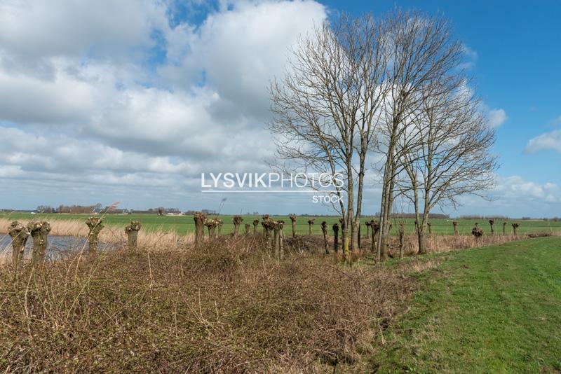 Plas met aangrenzend geknotte wilgen in het poldergebied van de Alblasserwaard