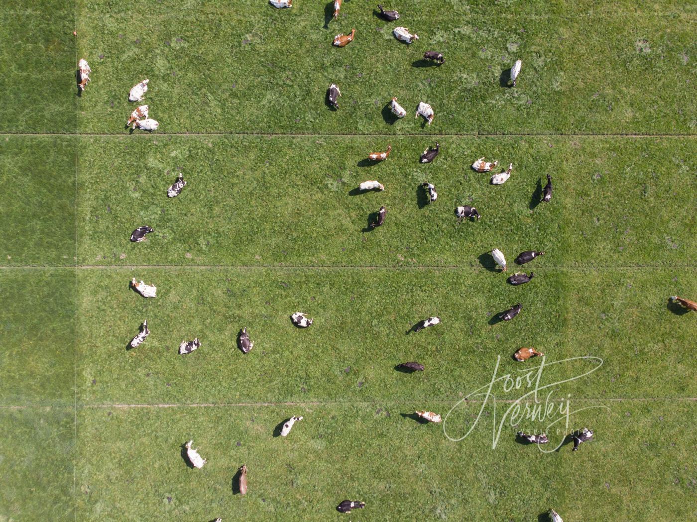 Luchtfoto van koeien die deels liggend genieten van het zonnetje in de wei. Dimensions: 4048 x 3032 Fotonummer: D01401200417