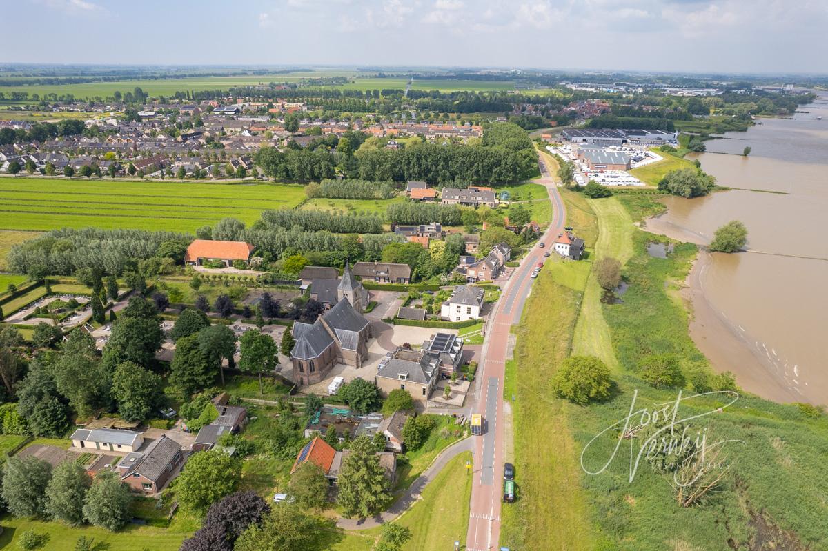 Luchtopname van de Lekdijk bij Langerak. In het midden het kerkgebouw van Langerak, wat één van de oudste kerken in Nederland is. Dimensions: 5464 x 3640 Fotonummer: D2406071168