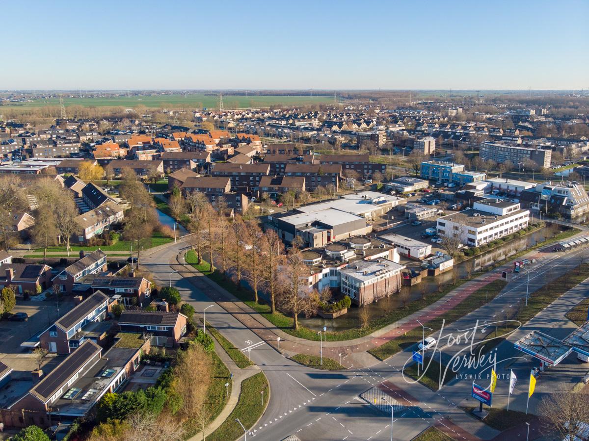 Luchtfoto bedrijventerreintje en woningen in de molenbuurt. Wijk Molenvliet in Papendrecht. Dimensions: 4048 x 3032 Fotonummer: D2401091958