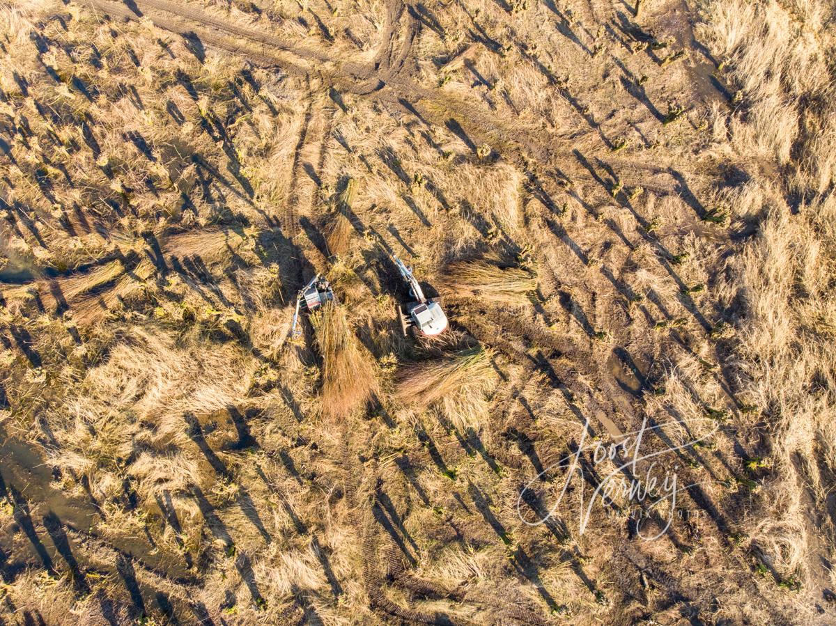 Luchtopname van griendwerkers die bundels geknotte wilgentakken verwerken in de buitendijkse grienden langs de rivier de Beneden-Merwede. Dimensions: 4048 x 3032 Fotonummer: D0507