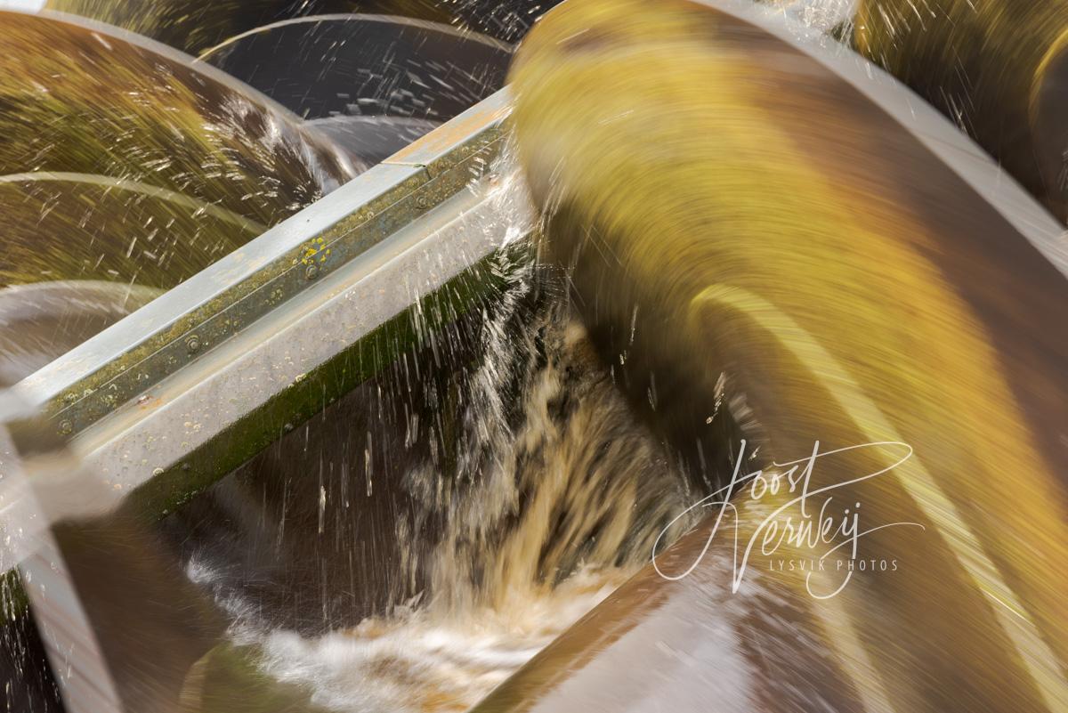Close-up van vijzels met schoepen van het J.U. Smitgemaal aan de Kinderdijk. De vijzels brengen het boezemwater omhoog naar een voorboezem annex maalkolk die via de Elshoutsluis loost op de Lek. De lange sluiterijd zorgt voor een extra efffect van het opgevijzelde water. Dimensions: 7360 x 4912 Fotonummer: D81013843